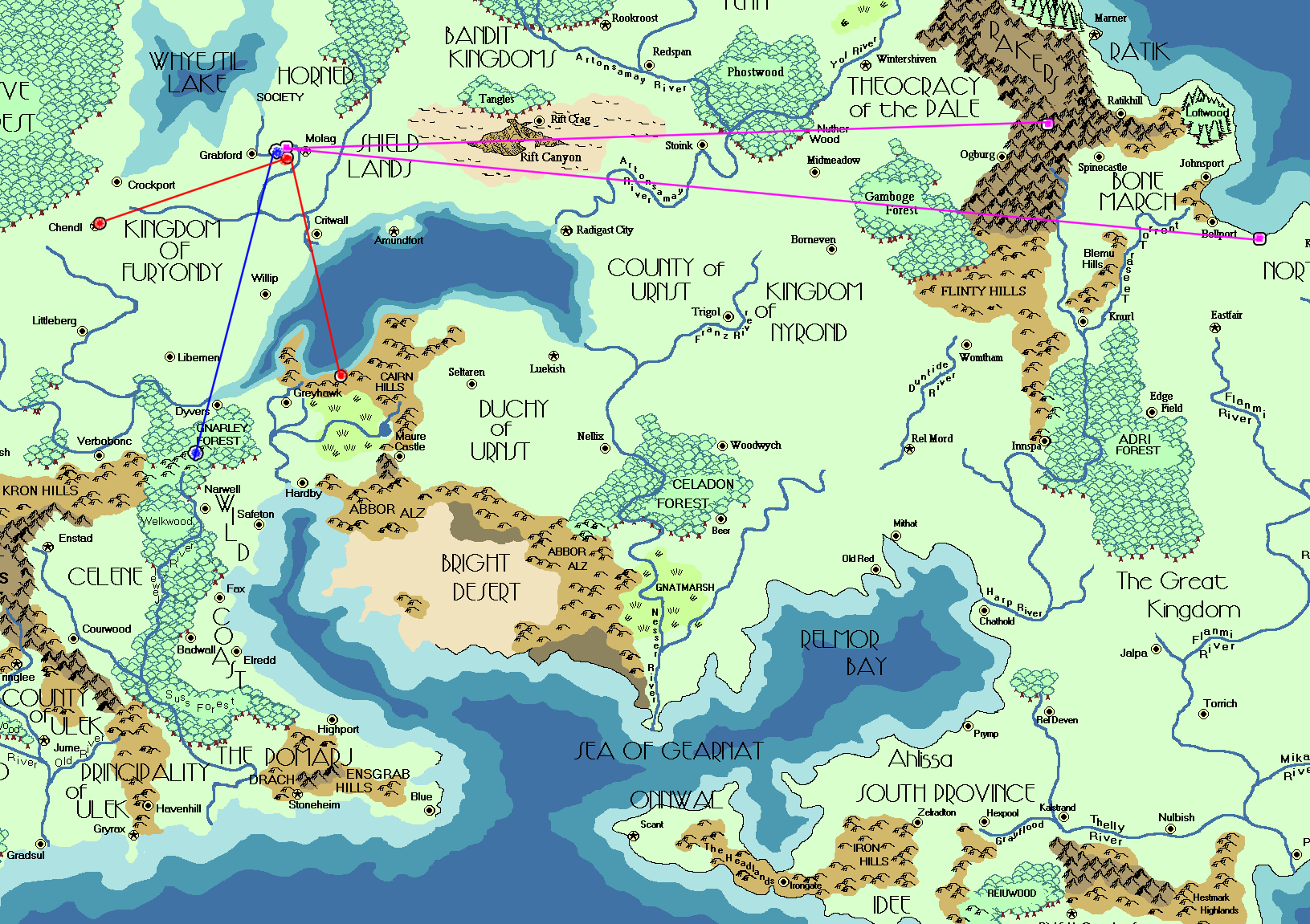 From Dragondale, there are gates to Chendl and Portown as well as Shadowbrook and Lionsgate. From Shadowbrook, the gate goes to Klarr and back to Dragondale. From Lionsgate, the gates connect with BloodStone and SeaHaven as well as Dragondale. |